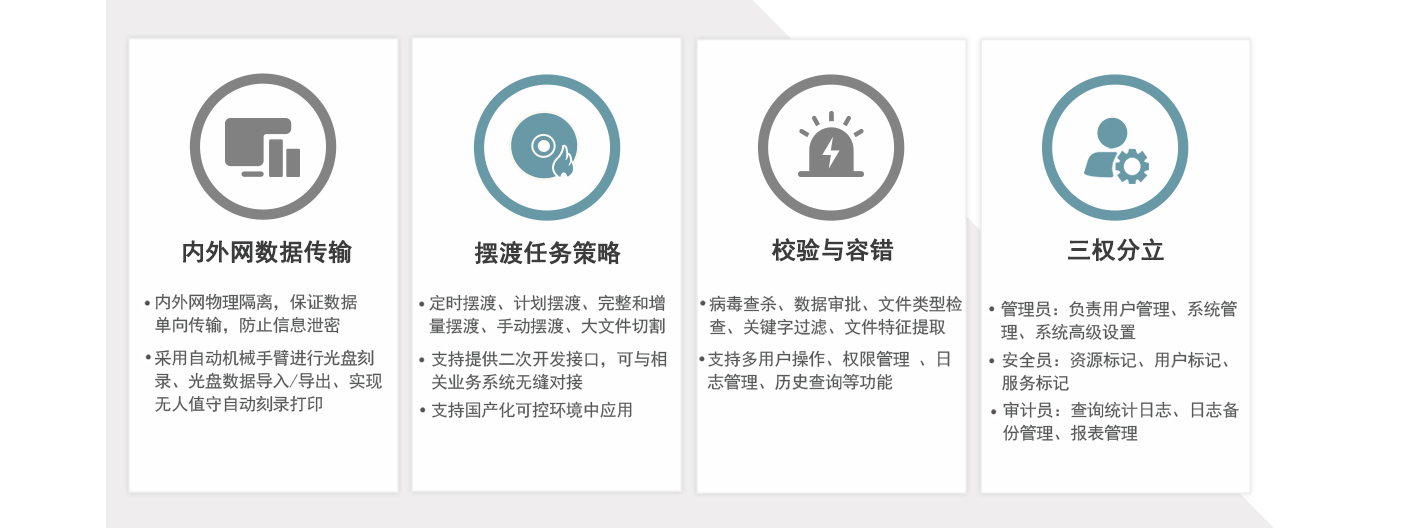 ●内外网物理隔离,采用自动机械手臂进行光盘数据交换,无人值守自动刻录打印