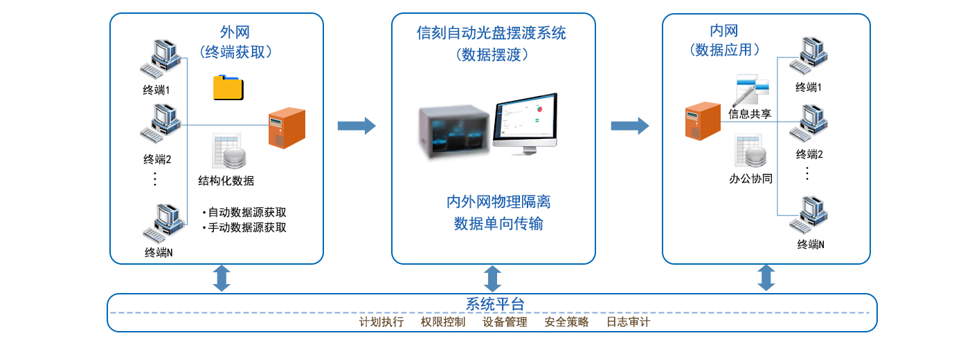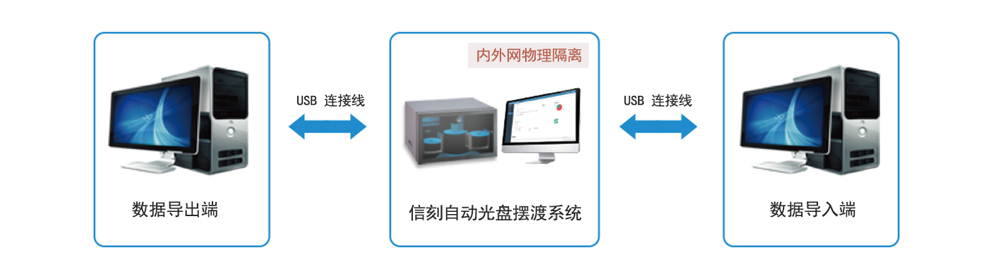 信刻内外网数据自动光盘摆渡系统,支持数据摆渡立即执行、执行一次、定时周期执行、每天/每周/每月定时执行等触发策略,集三员分立管理权限、数据检查校验、容错及提醒、多用户操作、日志管理、历史查询等功能于一体,采用全自动,高可靠性的机械手臂更换光盘,替代传统的手工刻盘,实现物理隔离的内网和外网间数据的单向传输、无人值守自动刻录打印、光盘数据导入/导出,有效避免黑客、病毒等网络攻击给内网数据带来的安全威胁,同时兼容无缝对接提供多类型平台的二次开发接口,可与第三方业务系统无缝对接,实现交换数据的审批、审计、日志等功能。